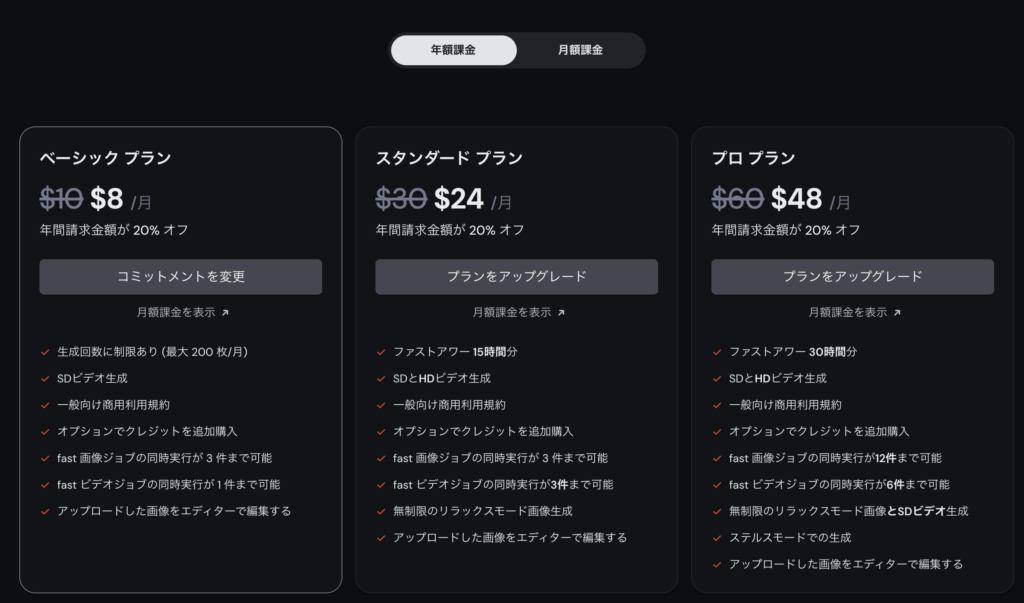 プロプラン 月額:$60 / 年額:$576 最も高速な生成が可能。プロ・ヘビーユーザー向け。
