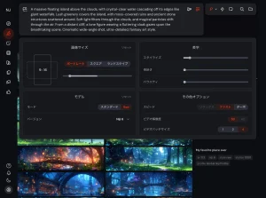 最初はシンプルなプロンプトからで大丈夫です。慣れてきたら「空中に浮かぶ島」「七色に光る湖」「未来都市と古代遺跡の融合」などのプロンプトを入れると一気にファンタジー感が出てきます。