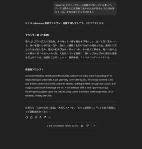 • 例(英語): A massive floating island above the clouds, with crystal-clear water cascading off its edges like giant waterfalls. Lush greenery covers the island, with moss-covered ruins and ancient stone structures scattered around. Soft light filters through the clouds, and magical particles drift through the air. From a distant cliff, a lone figure wearing a fluttering cloak gazes upon the breathtaking scene. Cinematic wide-angle shot, ultra-detailed, fantasy art style.